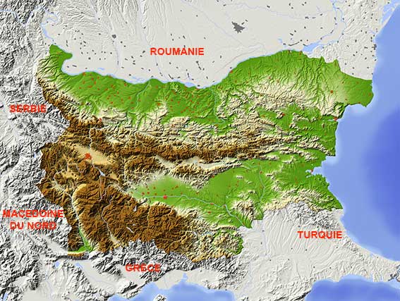 La Bulgarie possède un relief très diversifié. Elle est divisée en bandes de montagnes et de plaines orientées Ouest-Est. Du Nord au Sud se succèdent le Plateau Danubien, une zone fertile, constituant le grenierdu pays ; le massif des Balkans (Stara Planina, trad. Vieille montagne),considéré comme faisant partie du Massif des Carpates ; une petite chaîne de montagnes (Sredna Gora, trad. Montagne/forêt du milieu/moyenne), dans laquelle on trouve la célèbre vallée des roses où non seulement se récoltent les roses mais où on y cultive plus de lavande qu’en France !!), la plaine Centrale de Thrace et le massif des Rhodopes qui fait frontière avec la Grèce (région mythique d’Orphée). La partie Est, près de la mer Noire, est constituée de collines. La partie Ouest du pays est constituée du massif du Rila avec le plus haut sommet des pays balkaniques,le Mont Musala (2 925 mètres) et la chaîne du Pirin, la deuxième plus haute montagne de Bulgarie. L'altitude moyenne de la Bulgarie est de 470 mètres.