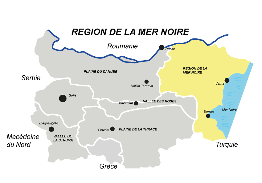 La région de la mer Noire (Bulgarie orientale) comprend 32 micro-régions différentes le long de la côte de la mer Noire et de la région de Ludogorie et comprend 30 % de l'ensemble des vignobles du pays. Cela comprend également les régions viticoles de Varna, Burgas, Pomorie, Dobrich, Silistra, Shumen et Targovishte.